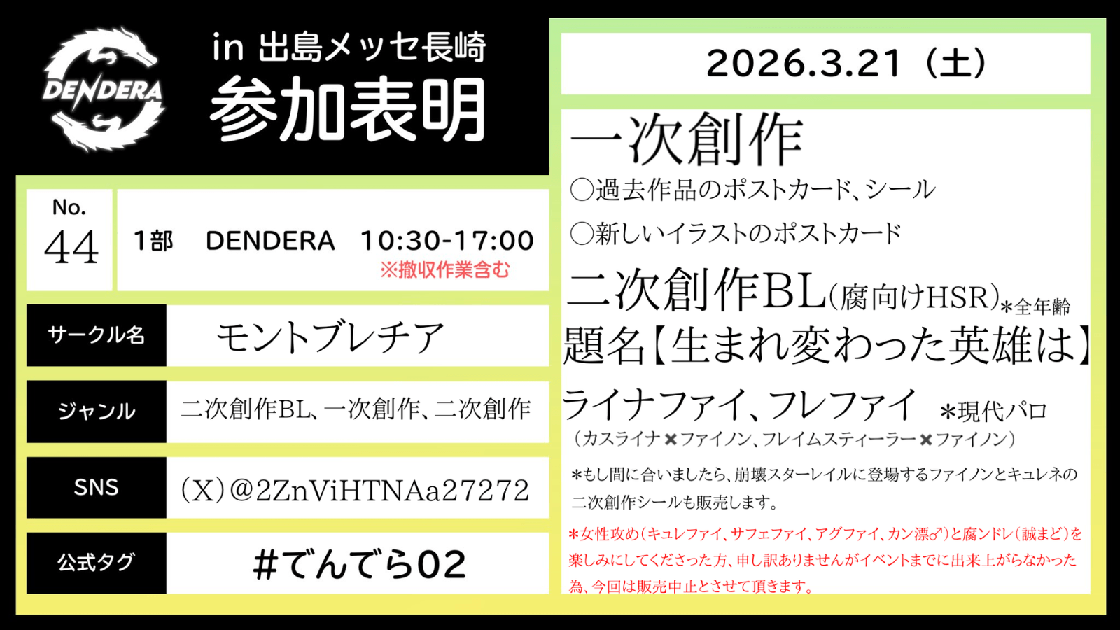 モントブレチア 2026 3/23 同人即売会 一次創作 同人誌 頒布物創作(自作のイラスト) / 二次創作BL(ハンドレより誠まど)(鳴潮より忌漂) / 二次創作女性攻め(崩スタよりキュレファイ等)SNSX(旧:Twitter) 同人即売会 一次創作 同人誌
